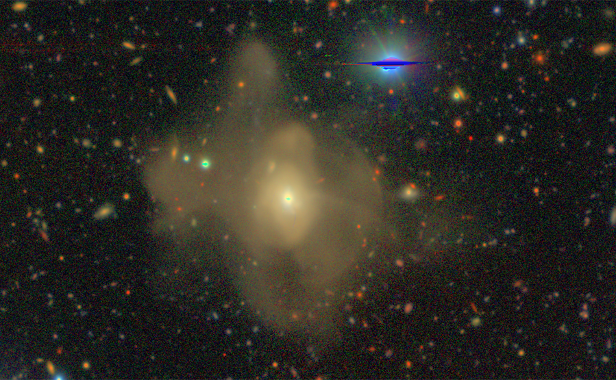 銀河の周りに尾のような構造や広がった構造が見えています。