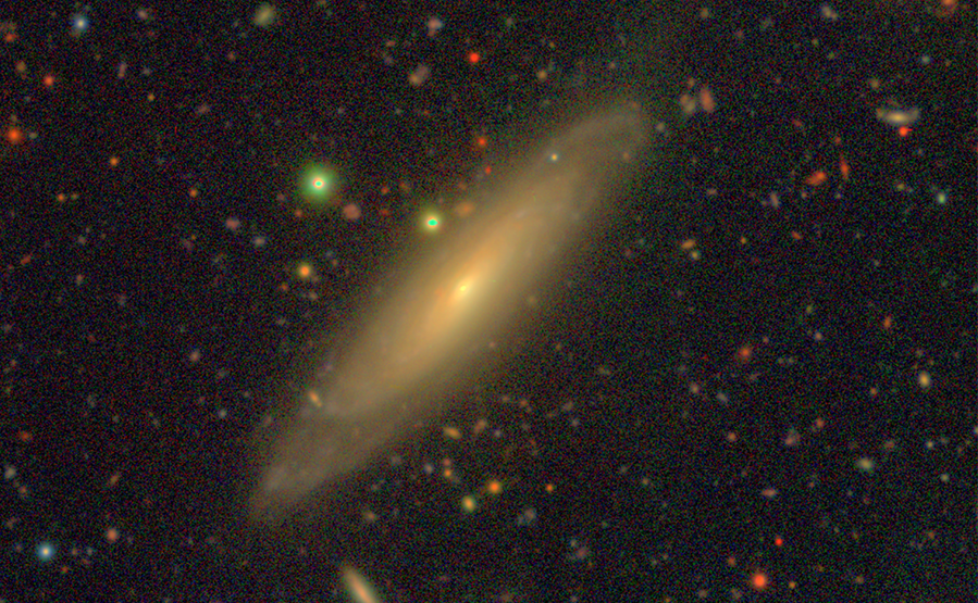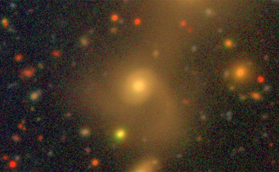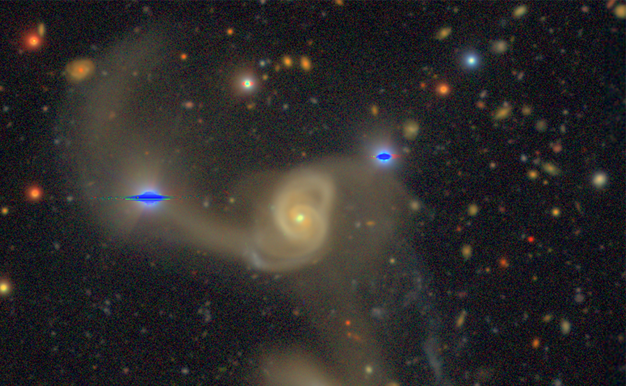 銀河の右下と左に引き伸ばされた尾のような構造が見えています。右上と左に淡い構造も見えています。