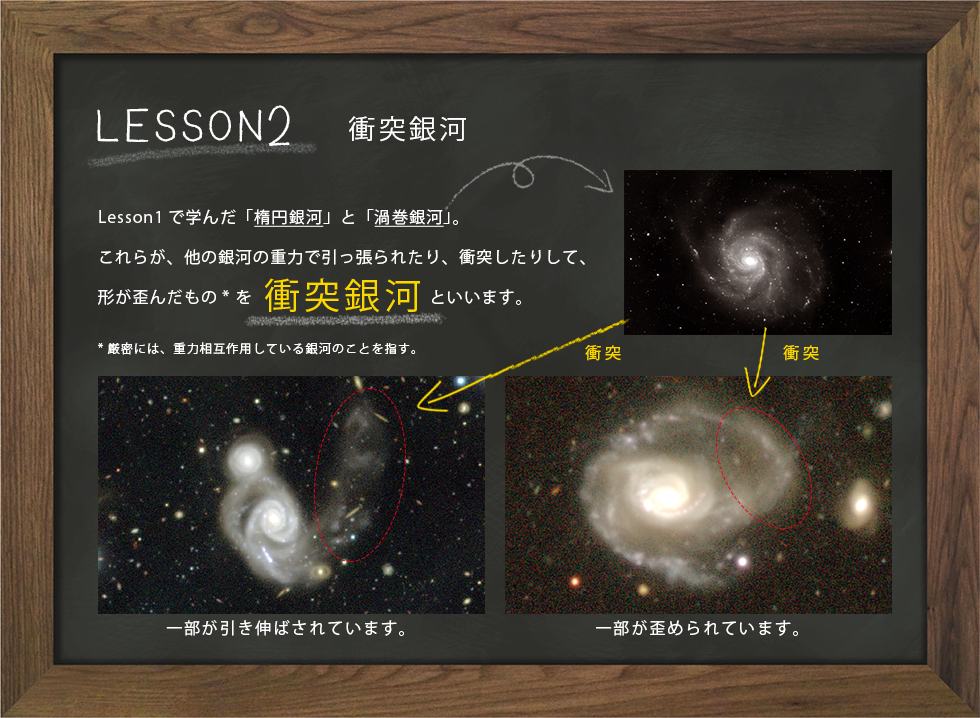 中級編では、銀河の形が歪むことについて学びます!(スライド1枚)